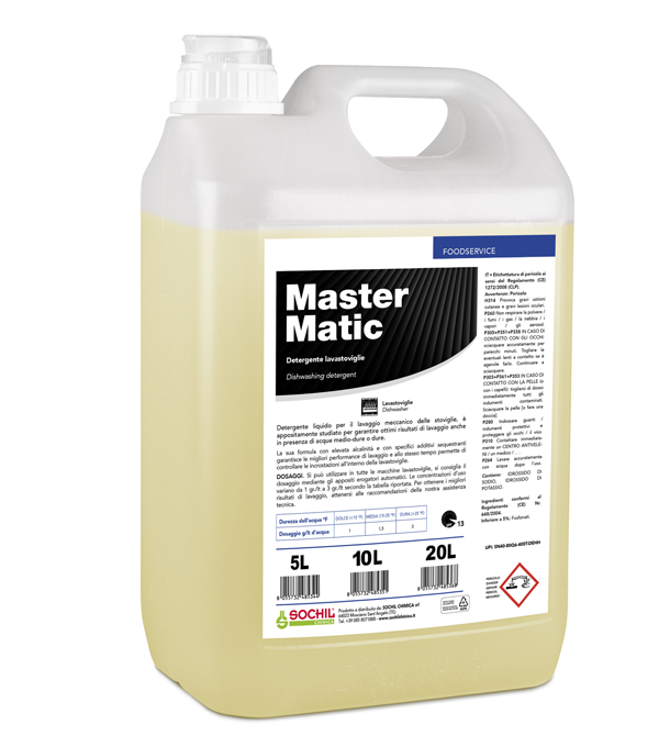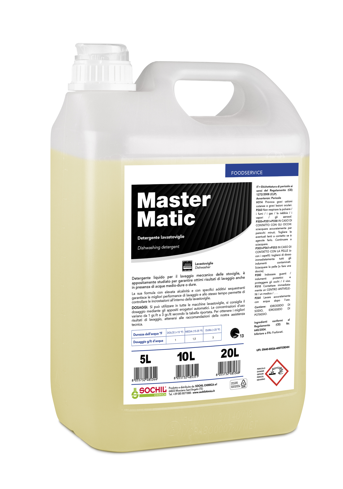 MASTER MATIC è un detergente esente da fosforo, per il lavaggio meccanico delle stoviglie, è studiato per garantire ottimi risultati di lavaggio alla presenza d’acqua medio - dure o dure.